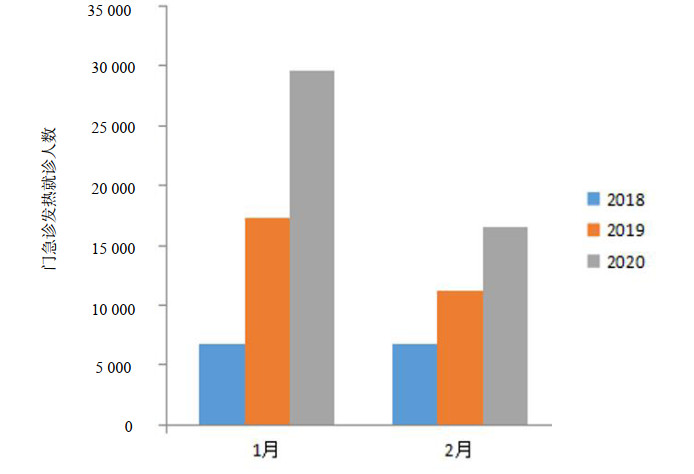 图 1 2018—2020年1、2月门急诊发热就诊情况