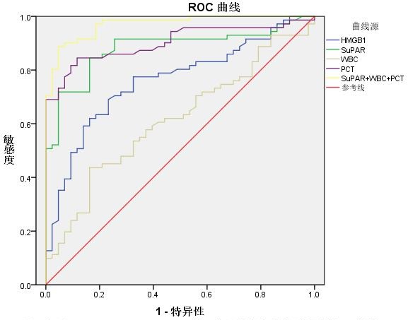 随着社会的发展,创伤的发生率日益增多,据统计创伤为我国45岁以下人口的第一致死原因,严重多发伤可引起广泛组织损害,诱发机体多种炎性细胞及因子,从而对患者器官功能产生损伤性的影响[1-2]。脓毒症是创伤患者死亡的一个重要原因,病死率高达25%以上[3-4],其发病机制与过度激活的炎症反应及抗炎反应密切相关[5]。虽然血培养是脓毒症诊断的金标准,但其耗时长,阳性率低,且治疗期间易受抗菌药物的影响[6-7]。但进行及早的诊断及科学干预是缓解脓毒症及改善预后的重点。本研究通过对严重多发伤患者血清HMGB1、suPAR、WBC、PCT动态监测,研究其与脓毒症早期预测及预后的关系。运用受试者工作特征曲线(ROC)分析HMGB1、suPAR、WBC、PCT单独及联合检测诊断严重多发伤患者发生脓毒症的效能,旨在为临床诊治创伤患者提供诊断价值较高及预测预后的细胞因子。