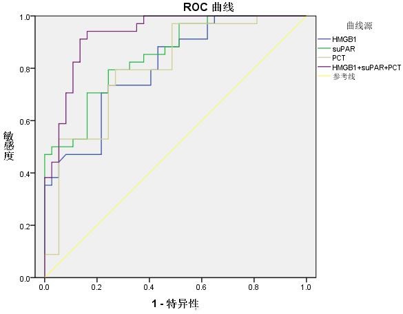 表 4中,取第1 d Sepsis组和非Sepsis组患者各指标进行统计分析,HMGB1、suPAR、WBC、PCT各指标的截断点分别为8.43 ng/mL、6.07 ng/L、17.53×109/L、4.07 ng/mL,单独诊断的灵敏度分别为69.01%、84.51%、43.66%、84.51%,特异度分别为76.74%、83.72%、83.72%、88.37%;联合诊断suPAR+WBC+PCT的灵敏度为88.37%,特异度为95.35%,单指标以PCT(AUC 0.902)诊断效能最佳,HMGB1+SuPAR+PCT(AUC 0.970)联合诊断效果更佳(图 5)。