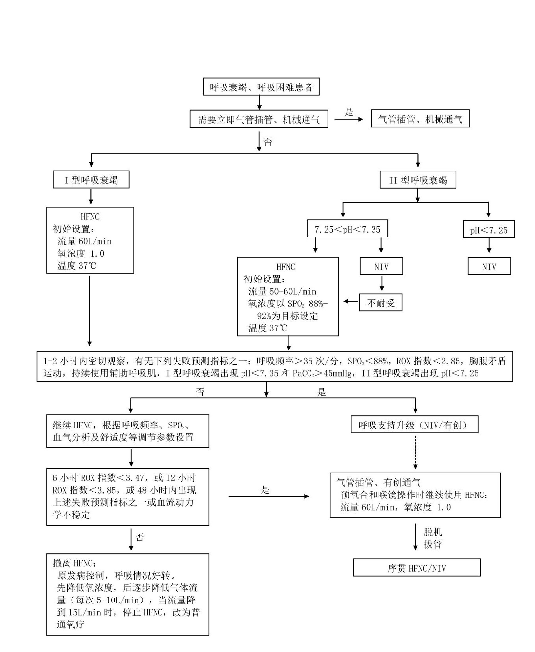 推荐意见11:在HFNC开始的1~2 h内应密切观察,如果出现任何一个失败预测指标(呼吸频率>35次/min,SPO2≤88%,ROX指数<2.85,胸腹部矛盾运动或使用辅助呼吸肌等),应及时进行呼吸支持升级(NIV或有创通气)。若使用HFNC 48 h呼吸情况仍无改善,仍存在任何一个上述失败预测指标,或ROX指数进行性下降,或血流动力学不稳定,视为HFNC治疗失败,建议升级为有创通气。(证据等级Ⅱ,推荐强度B)