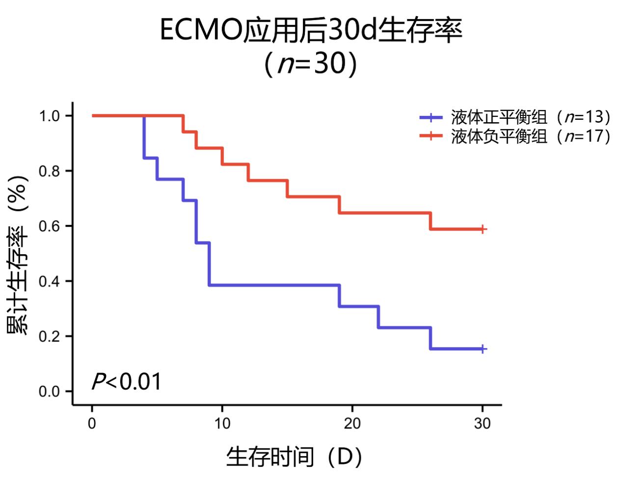 30例患者以CBF正负值分组,液体正平衡组13例,存活2例,死亡11例,其中6例液体超负荷患者(CFB>10%)全部死亡。液体负平衡组17例,存活10例,死亡7例。两组间年龄、体质量、性别、每日液体负荷、Gensini评分、ECMO治疗及死亡时间差异无统计学意义(均P>0.05)。液体负平衡组24 h VIS显著低于液体正平衡组[35.7(22.9,51.0) vs 80.0(48.0,166.3),P < 0.05],液体负平衡组病死率显著低于液体正平衡组(7/17 vs 11/13,P < 0.05),负平衡组ECMO应用后30 d的生存率亦显著高于正平衡组(P < 0.05),见表 3和图 1。