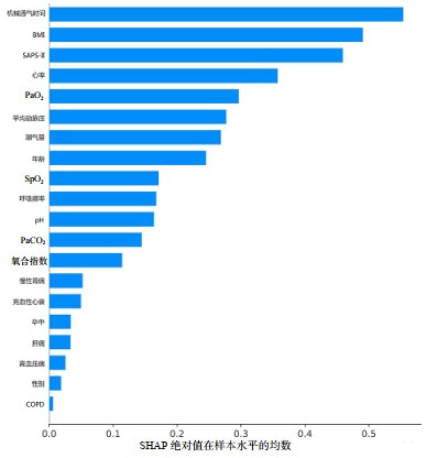 | BMI为体质量指数,SAPS-Ⅱ为简化急性生理评分Ⅱ,PaO2为氧分压,SpO2为脉氧饱和度,PaCO2为二氧化碳分压,COPD为慢性阻塞性肺疾病,SHAP绝对值即SHapley Additive explanation 图 1 机器算法XGBoost模型预测48 h再插管特征重要性 Fig 1 The importance of features in machine algorithm XGBboost model for predicting 48-h reintubation |