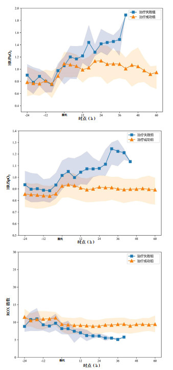 治疗失败组患者在撤机后48 h内,HR/PaO2和HR/SpO2增加,ROX指数降低,见图 2。