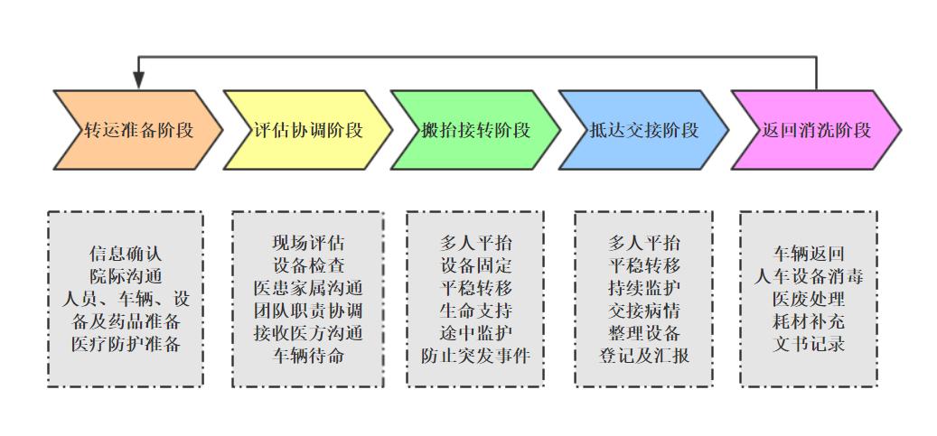 2020年1月1日至2020年5月31日,武汉市急救中心成功转运多例ECMO支持下的重症新冠肺炎患者,未出现一例不良事件,转运团队组成由急救中心ECMO转运医护团队和ECMO医师团队一起协作完成[8]。本研究经伦理委员会审批,批准件号:WHCDCIRB-K-2021023。现总结转运经验,规范各阶段流程,如图 1