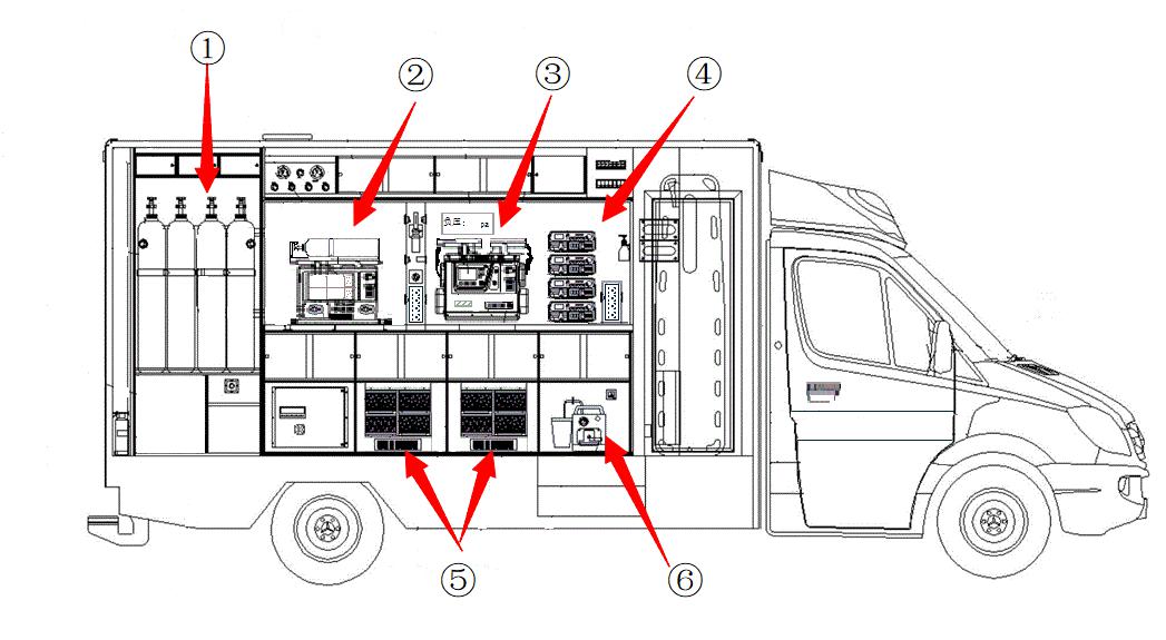① 车载氧气瓶;②便携式氧气瓶;③便携式一体式除颤监护仪;④便携式呼吸机(气动电控或电动电控)及配套一次性管路及过滤器;⑤多组输液泵(2组以上);⑥便携式车载吸痰器;⑦220 V车载电源(承载1 200 W以上),需有足够的电源接口(5个以上),见图 2