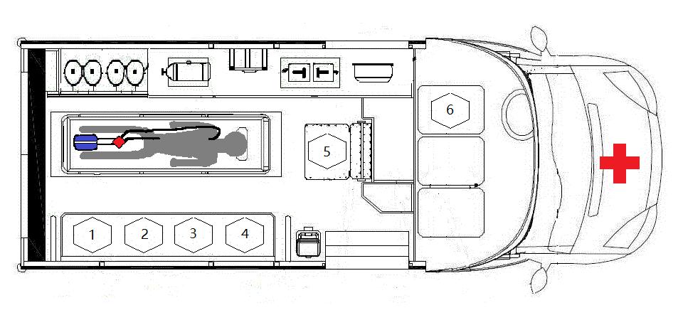 1号位:ECMO团队队长,观察并及时调整ECMO主机;2号位:ECMO治疗师,观察ECMO循环泵及静脉管路情况监护患者生命征变化;3号位:急救转运团队护士,负责管理及调整输液、氧气、吸痰、微量泵的使用,在ECMO治疗医师指导下进行药物使用;4号位:ECMO呼吸治疗师,观察并管理患者气道,监控机械通气情况;5号位:急救转运医师,总体协调患者转运事宜的管控;6号位:急救转运团队驾驶员 图 4 负压救护车随车人员分布的平面图