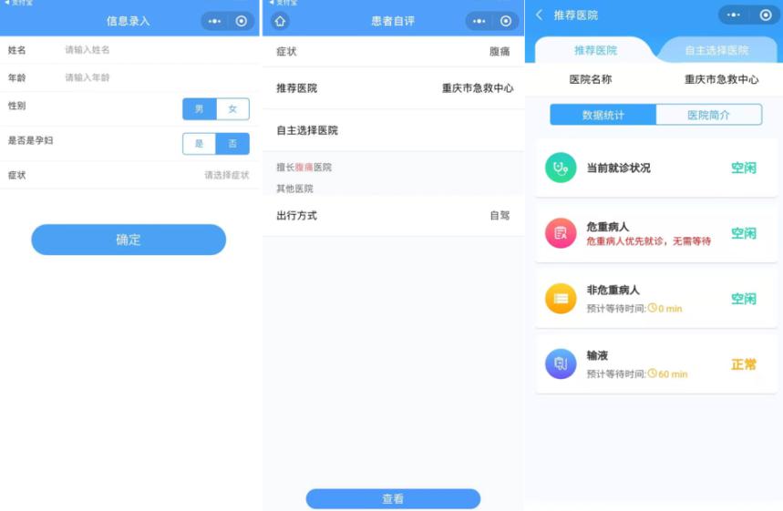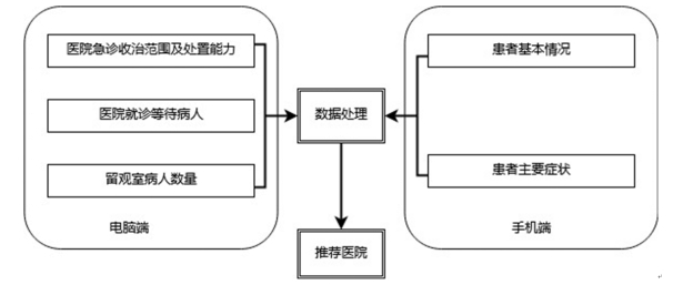 急诊透视系统包括:电脑PC端(管理端)和微信小程序端(患者端)。运用Java软件开发技术、高德地理位置服务技术、知识库自动匹配技术等,通过管理端的提前匹配设置管理,为急诊患者推荐路程近、等待时间短、有相关救治能力的医院。