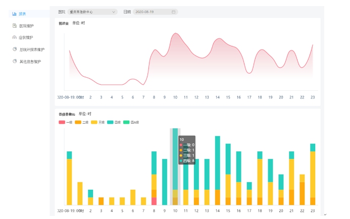 1.2.1 电脑PC端(管理端)① 急诊透视系统通过接入各医院急诊信息系统,实时收集各个医院当前各级急诊患者人数、留观患者人数、各级患者在急诊停留时间,通过急诊患者实时人数结合既往各级患者滞留时间估算患者就诊需等待时间;②急诊管理人员提前对医院救治范围通过知识库关联进行设置,同时对各级患者等待时间进行修正,确保系统推荐结果的可靠性;③管理人员通过PC端登录系统后台可获取各医院以及区域内医院的部分急诊质控资料,如:急诊患者人数、各级急诊患者占比、患者急诊停留时间。同时可以获取区域内各个时段急诊患者分布、患者主要症状等(图 2)。