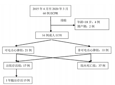 1 资料与方法 1.1 一般资料以2015年4月至2020年3月南京医科大学第一附属医院急诊中心60例ECPR患者为研究对象。本中心ECPR的启动指征:①可逆性病因;②年龄 < 80岁;③有目击的心脏骤停;④心脏骤停时间 < 30 min;⑤基础疾病非终末状态[3-4]。60例患者均成功启动ECPR治疗,并遵照成人体外膜肺氧合辅助心肺复苏(ECPR)实践路径系统化管理[4]。本研究的排除标准:①年龄 < 18岁的ECPR患者(4例);②妊娠或围产期的ECPR患者(2例)。最终,54例成人ECPR患者纳入分析(见图 1)。本研究已获得本院伦理委员会批准(伦审号:2019-NT-12)。