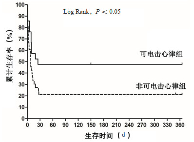 | 图 2 可电击心律组与非可电击心律组的1年预后比较 Fig 2 Comparison of 1-year prognosis between the shockable and unshockable initial rhythm groups |