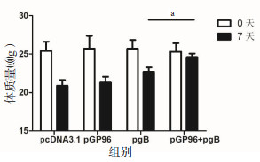 腹腔注射7 d后,检测各组小鼠体质量,结果显示各组小鼠体质量均有所下降,但pGP96+pgB组小鼠比pgB组体质量下降幅度更小,差异具有统计学意义(P<0.05)(表 2、图 2)。