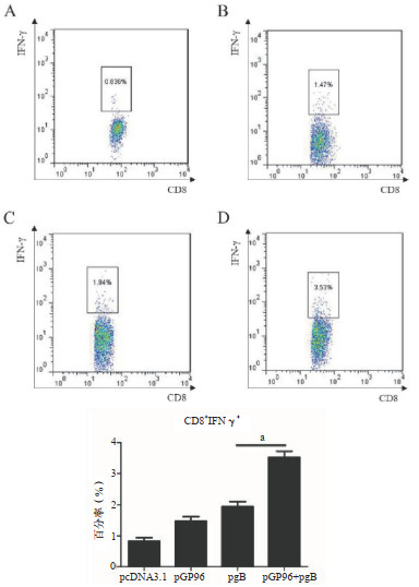 | A: pcDNA3.1组, B: pGP96组, C: pgB组, D: pGP96+pgB组, E: 各组结果柱状图(n=8)。pgB组与pgB+pGP96组相比,aP<0.05 图 3 各组分泌IFN-γ的CD8+T淋巴细胞流式检测结果 |