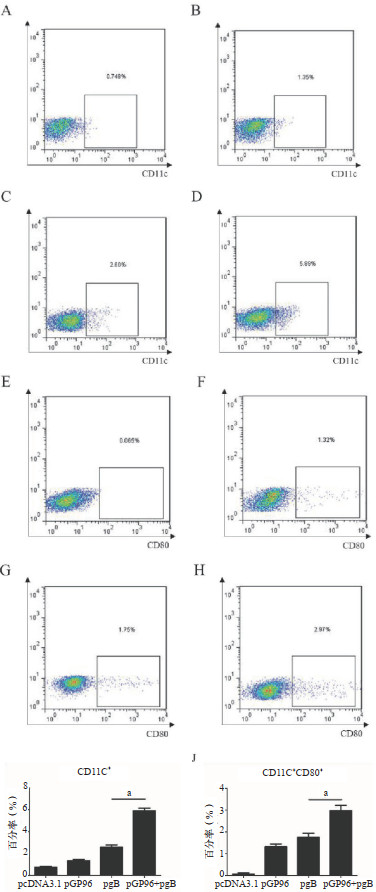 | A: pcDNA3.1组, B: pGP96组, C: pgB组, D: pGP96+pgB组, E: pcDNA3.1组, F: pGP96组, G: pgB组, H: pGP96+pgB组, I、J: 各组结果柱状图(n=8)。pgB组与pgB+pGP96组相比,aP<0.05 图 4 各免疫组小鼠肠系膜淋巴结单细胞的DC的数量与成熟度 |