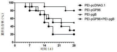 1.3 免疫接种取32只小鼠随机(随机数字法)分4组:pcDNA3.1组、pGP96组、pgB组和pGP96+ PEI-pgB组。将gB和GP96两种质粒用PEI包裹后,分别在各组小鼠经鼻腔滴入相应的质粒50 μg,每2周一次。每次接种后隔周收集粪便,并从小鼠眼眶后静脉丛采血0.1 mL离心取血清。末次免疫2周后,经腹腔注射3LD50 MCMV培养上清液。称量各组小鼠腹腔注射前及注射7 d后的体质量。取40只小鼠随机随机数字法分4组同上操作,末次免疫两周后以致死剂量(5LD50)MCMV培养上清液经腹腔注射,逐日观察各组小鼠染毒后的存活情况,共观察28 d。