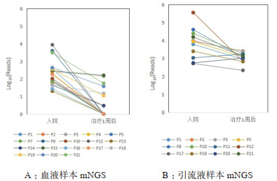 检测结果为阴性时认定Reads数为0,纵坐标为Log10(Reads)。18例患者完成2次血液样本检测,12例患者完成2次引流液样本检测,配对数据以直线连接。 图 1 治疗前后血液样本(A)和引流液样本(B)mNGS检出致病病原体Reads数变化 Fig 1 Changes of the number of Reads in blood sample (A) and drainage fluid sample (B) before and after treatment