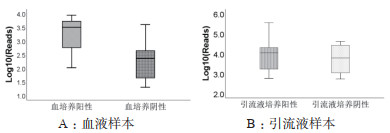 A:血培养阳性组患者血液样本mNGS检出致病病原体Reads显著高于血培养阴性组,P<0.05。B:引流液培养阳性组与阴性组之间,引流液样本mNGS检出致病病原体Reads数差异无统计学意义,P=0.116。 图 2 常规微生物培养结果阳性、阴性两组中mNGS检出致病病原体Reads数的对比 Fig 2 Comparison of the number of pathogenic Reads detected by mNGS in the positive and negative groups of routine microbial culture