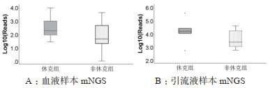 本研究比较两组中致病病原体为肺炎克雷伯菌的25例患者mNGS检测出的致病病原体Reads数。结果显示:血液样本中肺炎克雷伯菌的Reads数在两组患者中差异无统计学意义(P=0.321);引流液样本中肺炎克雷伯菌的Reads数,脓毒性休克组高于非休克组,差异有统计学意义(P < 0.05)(图 3)。