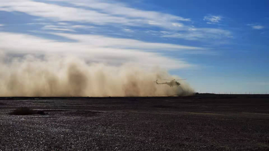 | 图 2 主着陆场荒漠地形与直升机降落时扬起的沙尘 Fig 2 The desert terrain of the main landing area and the dust kicked up by the helicopter landing |