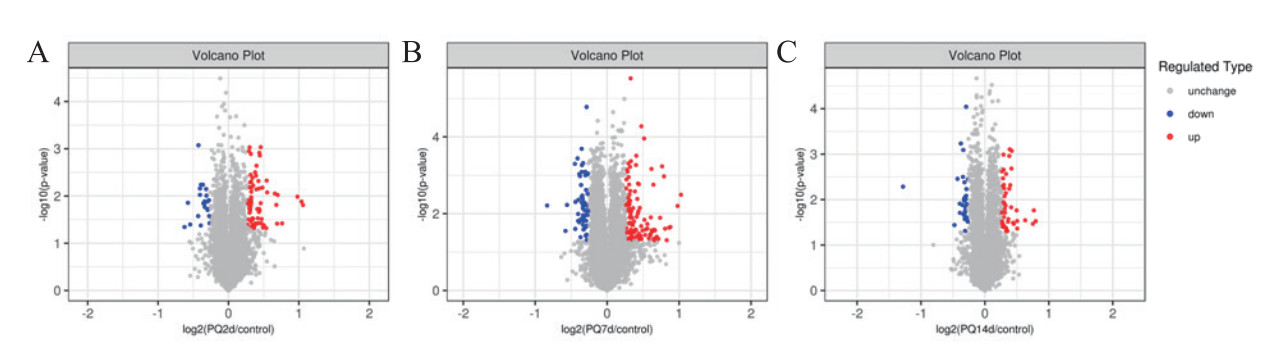 | A: PQ-2d vs Control组,B: PQ-7d vs Control组,C: PQ-14d vs Control组 图 2 差异蛋白表达火山图 Fig 2 Volcano plot of the differentially-expressed proteins |