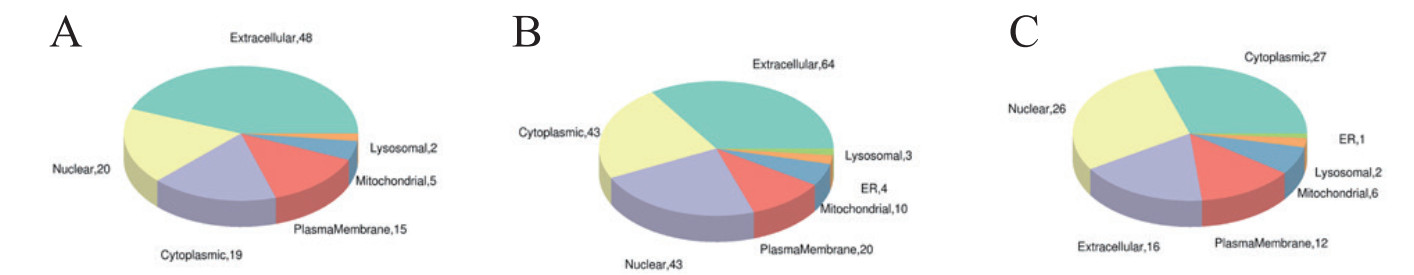 | A: PQ-2 d vs Control组,B: PQ-7 d vs Control组,C: PQ-14 d vs Control组 图 4 差异蛋白亚细胞定位分布图 Fig 4 Differentially-expressed protein distribution in subcellular organelles. |
