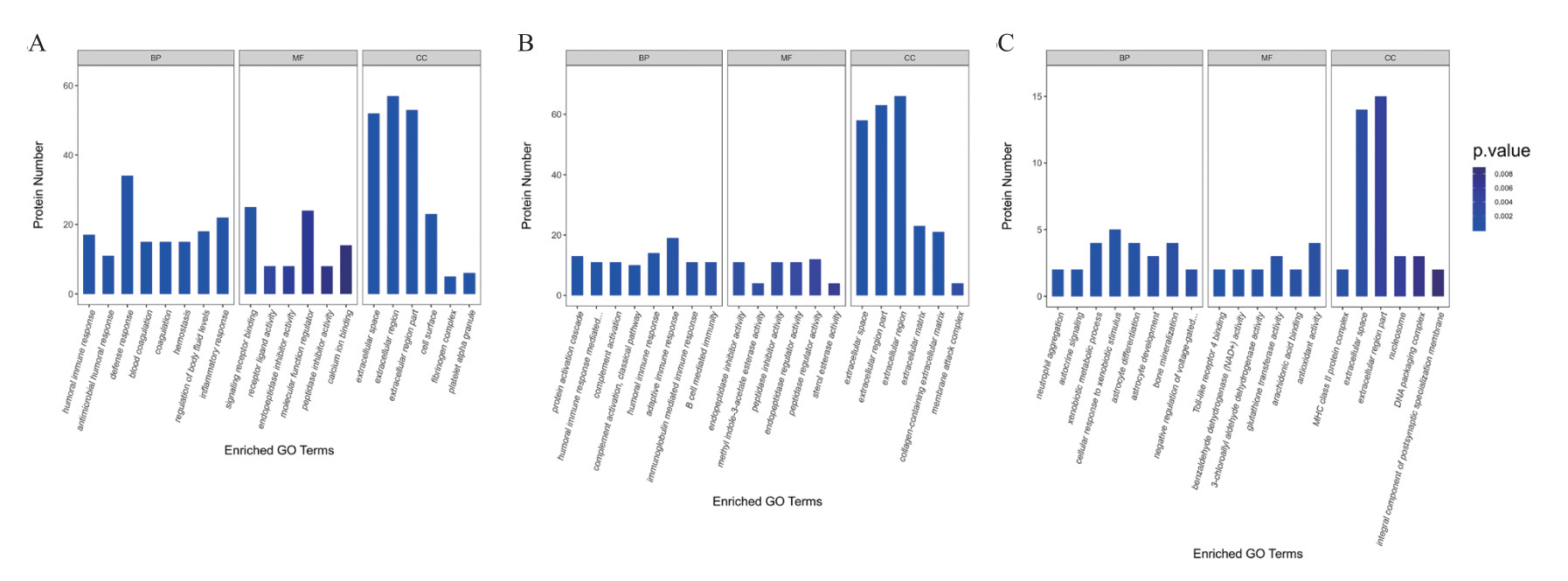 | A: PQ-2 d vs Control组;B: PQ-7 d vs Control组;C: PQ-14 d vs Control组 图 5 显著差异蛋白GO功能注释图 Fig 5 Gene ontology function annotation of differentially-expressed proteins |