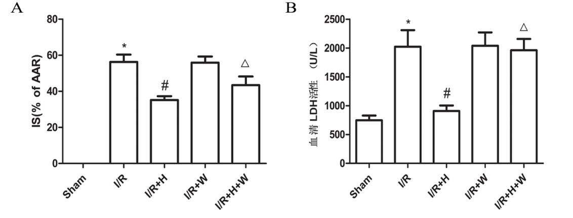 与Sham组相比,I/R组血清LDH活性明显增高(P < 0.05);与I/R组相比,I/R+H组血清LDH活性显著降低(P < 0.05);与I/R+H组相比,H/R+H+W组组血清LDH活性显著升高(P < 0.05)。而I/R+W组与I/R组相比血清LDH活性差异无统计学意义(图 1B)。