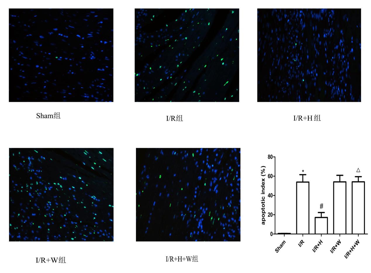 与组相比,I/R组心肌细胞凋亡指数显著增高(P < 0.05);与I/R组相比,I/R+H组心肌细胞凋亡指数显著降低(P < 0.05);与I/R+H组比较,I/R+H+W组心肌细胞凋亡指数显著增高(P < 0.05)。而I/R+W组与I/R组相比心肌细胞凋亡差异无统计学意义(图 3)。