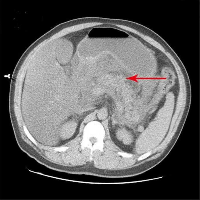 | 胰腺弥漫性增大,密度不均匀减低,周围间隙模糊并多发片絮状、索条状渗出影,胆囊不大,囊内未见明显异常密度影。 图 1 患者入院时腹部CT |