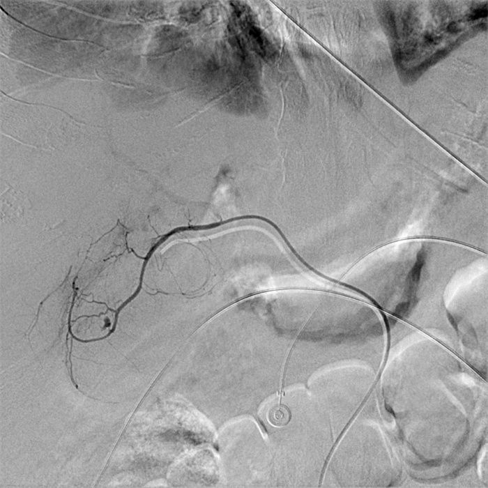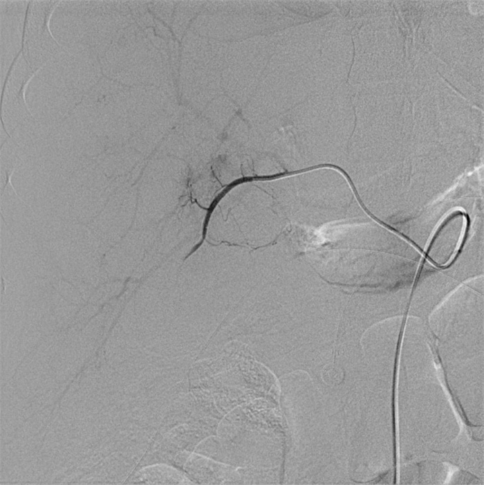 | 胆囊动脉增粗,其分支局部造影剂外溢,未见明显动脉瘤征象 图 3 胆囊动脉造影 |