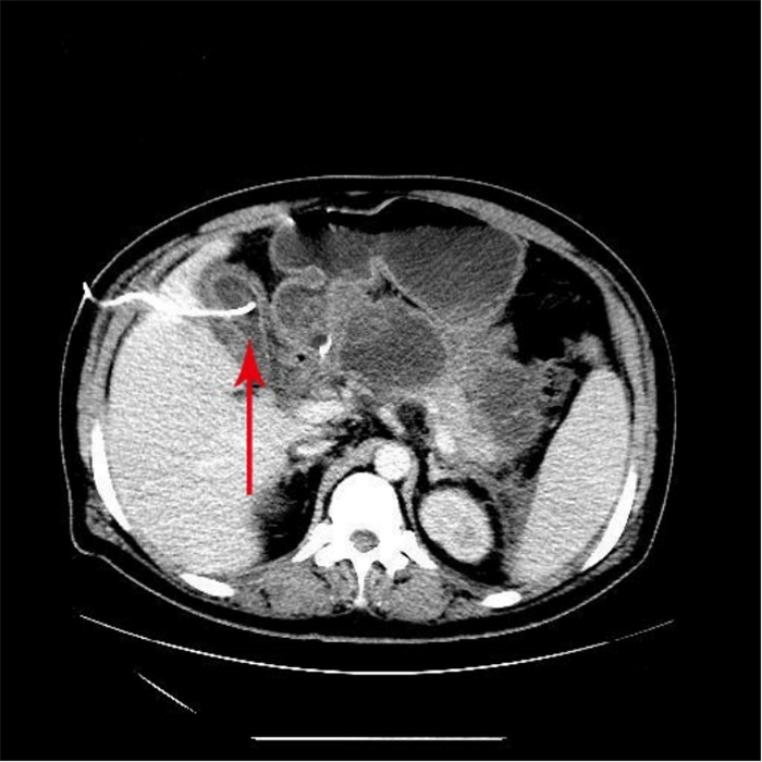 | 置管置入内端位于胆囊中,位置良好 图 5 经皮经肝胆囊穿刺置管后腹部CT |