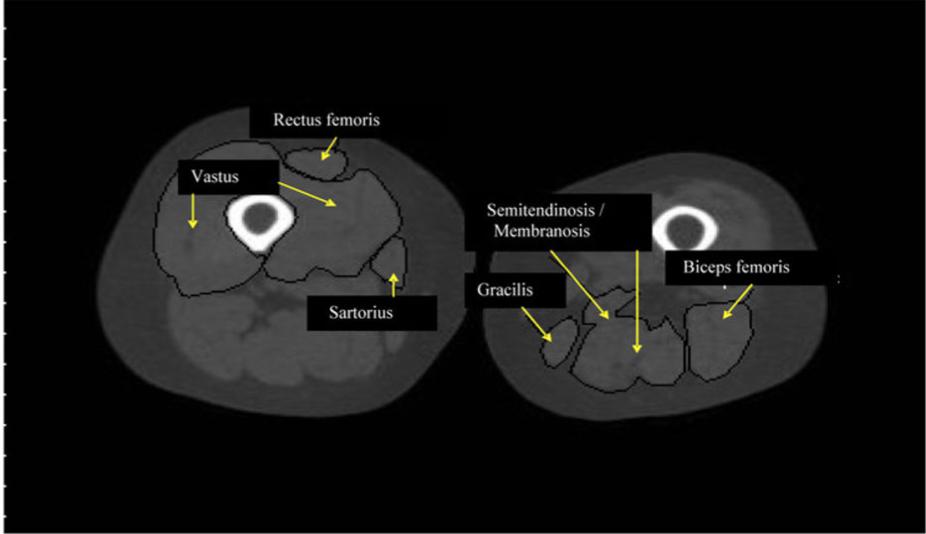 尽管这样的定义贴近临床,可操作性强,但因为神经重症患者普遍存在的意识障碍,因癫痫、躁动等原因导致临床镇静镇痛及肌松药物的使用,以及因损伤而引起偏瘫、运动能力丧失、肌张力增高等临床情况,导致运用量表以及握力计等需要患者参与度高的方式实施肌少症的评估存在难度。同时,传统的肌少症检查的辅助手段,例如生物电阻抗,双能X线[9-10]等,受患者转运、设备等条件限制也无法实施。一些新的途径和方法尚在探索阶段[11-12],整体来看,目前大多的研究主要聚焦在利用影像技术(CT或磁共振)测量某个截面上肌肉的面积,藉此判断骨骼肌的损失与预后之间的关系。Ryan通过磁共振对比卒中后患者偏瘫侧与健侧股四头肌肌肉,发现两者存在着显著的差异(见图 1)。