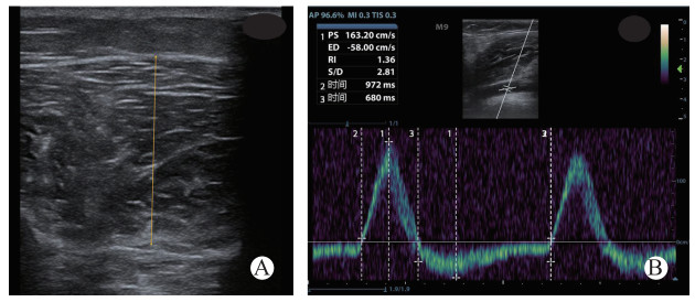 | PS:收缩期最大血流速,ED:舒张期最小血流速,RI:阻力指数,时间2为一个心动周期总时间,时间3为舒张期反向血流时间。 图 1 小腿胫前筋膜室厚度(A)和下肢动脉多普勒血流频谱测量(B) Fig 1 A: Measurement of the limb anterior compartment thickness; B: Measurement of Doppler blood flow waveform of limb arteries. |