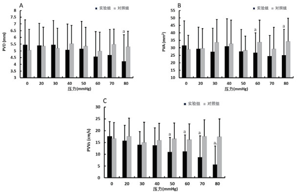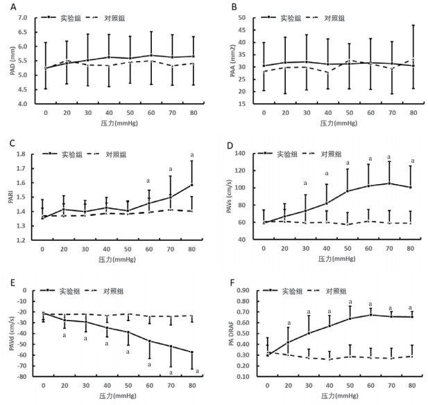 实验组与对照组PAD、PAA、PVD、PVA、DAVd、DARI比值在不同压力时差异无统计学意义(均P > 0.05)。PAVs、PAVd、PARI、PADRAFR、PVVs、DAPTWR两组比值在压力增加时比值逐渐增大(分别F=14.184、21.602、3.548、28.759、8.553、13.096,均P < 0.05),DAVs和DASFAFR实验组与对照组比值加压后比值逐渐减小(分别F=9.64、6.097,均P < 0.05)。