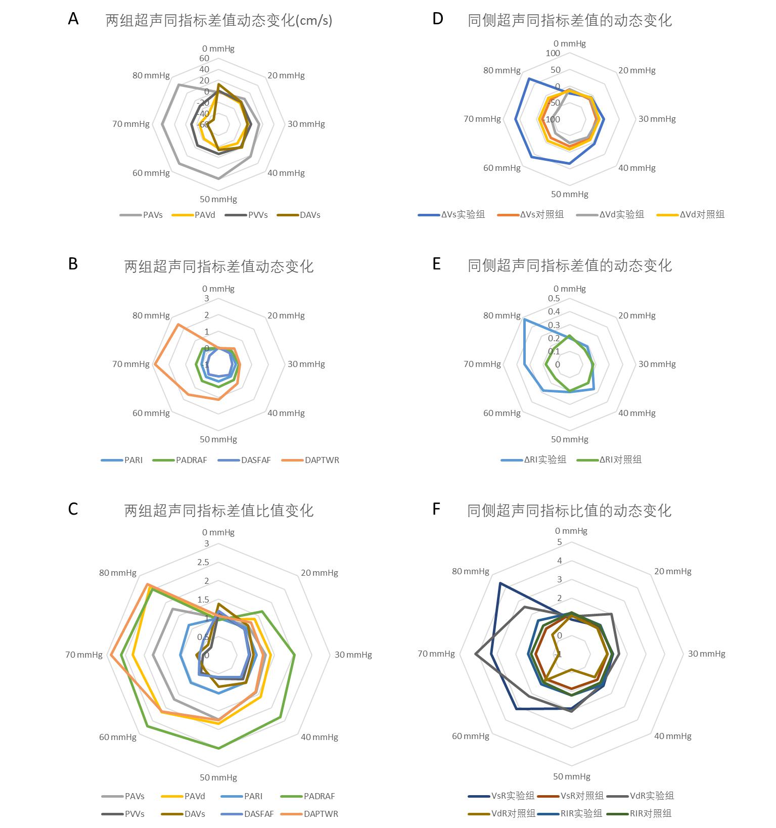 三血管超声指标的实验组与对照组差值、比值的动态变化见图 4。实验组与对照组PAD、PAA、PVD、PVA、DAVd、DARI差值在不同压力时差异无统计学意义(均P > 0.05)。PAVs、PARI、PADRAFR、DAPTWR实验组与对照组差值在压力增加时逐渐增加(分别为F=18.923、3.245、26.801、13.885,均P < 0.05),PAVd、PVVs、DAVs、DASFAFR实验组与对照组差值在压力增加时逐渐减小(分别F=26.201、8.141、12.956、5.083,均P < 0.05)。