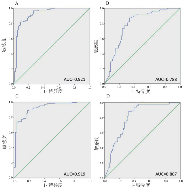 | A、B:自变量分别为PADRAF、DASFAFR,应变量为灌注压≥30 mmHg; C、D:自变量分别为PADRAF、DASFAFR,应变量为ICP ≥30 mmHg 图 5 ROC曲线分析 Fig 5 ROC curve analysis |