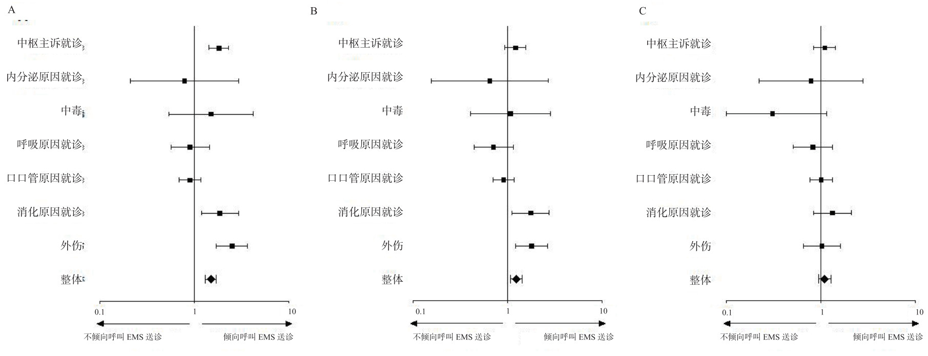 A: 未使用倾向性评分校正;B:9变量倾向性评分校正模型;C:22变量倾向性评分校正模型 图 2 不同模型中EMS与患者病情危重程度关系 Fig 2 The relationship between the EMS use and severity of patients in different models