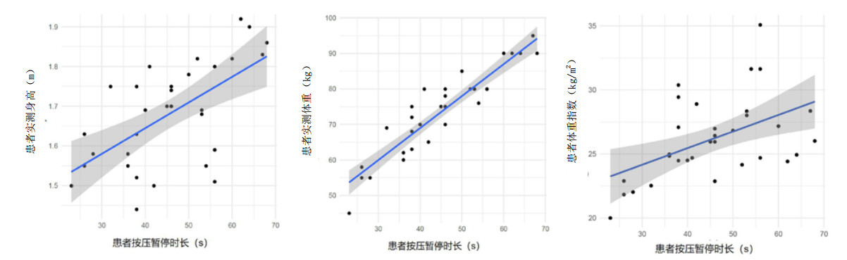 对于入选相关影响指标进行单因素线性相关分析显示,患者身高、实际体重、体重指数与按压暂停时长呈线性正相关(P < 0.01),见表 2、图 1。