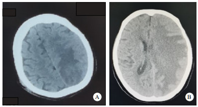 A:3月29日头CT示左侧额、顶、枕叶片状水肿;B:4月16日头CT示大脑左半球大片不规则低密度灶,其内团块样混杂密度;大脑镰下疝 图 1 患者头部CT检查结果
