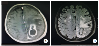 A:4月19日头部增强核磁示左侧额顶叶多发脓肿,中间有窦道连通;B:5月18日头部核磁示脓肿减小,脑疝消失 图 2 患者头部核磁检查结果