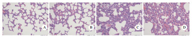 | A: Sham组;B:ALIMi组;C: ALIMo组;D:ALIS组 图 1 各组小鼠肺组织HE染色(×200) Fig 1 H & E staining of lung tissues from each group(×200) |