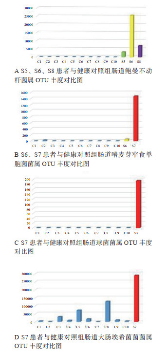 脓毒症组患者中S5、S6、S7、S8号脓毒症患者痰培养阳性,S7患者血培养阳性。痰培养结果:鲍曼不动杆菌(患者编号为S5、S6、S8)、嗜麦芽窄食单胞菌(患者编号为S6、S7)、肠球菌属(患者编号为S7);血培养为大肠杆菌(患者编号为S7)。由图 1可见临床细菌培养阳性的脓毒症患者其肠道菌群中已有相应菌属比例升高。