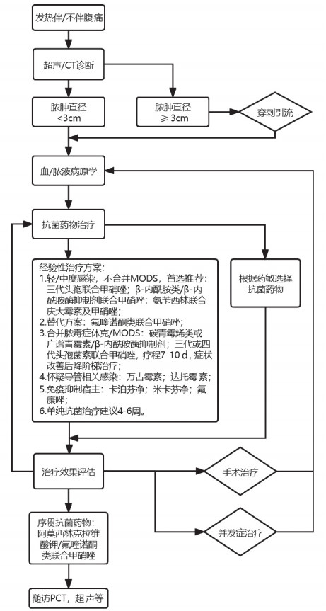 6 总结细菌性肝脓肿是细菌通过各种途径侵入肝脏导致的肝内局灶性炎症及化脓性渗出,其中隐源性肝脓肿发病率逐年升高。细菌性肝脓肿的患者临床症状和体征往往不典型,容易造成临床误诊或漏诊。B超仍然是肝脓肿诊断的一线检测手段。近年来肺炎克雷伯杆菌成为我国细菌性肝脓肿的主要致病菌,高毒力的肺炎克雷伯菌易引起肝外侵袭综合征。尽早完善病原学检查是治疗细菌性肝脓肿的基石,血及脓液的高通量测序对于常规培养阴性的患者有助于病原体早期诊断。超声或CT引导下的经皮肝脓肿穿刺置管引流是获取病原学依据的重要手段,同时也是细菌性肝脓肿的首选疗法。在获得病原学依据前建议经验性抗菌治疗,因目前尚无高质量临床数据支持,治疗方案需动态评估病情并结合培养和药敏结果及时调整。