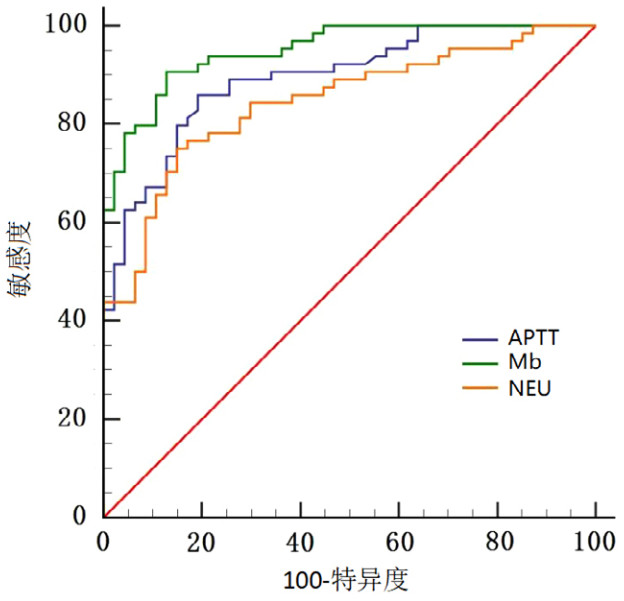 | 注:Mb为肌红蛋白;APTT为活化部分凝血活酶时间;NEU为中性粒细胞绝对值;MODS为多器官功能障碍综合征;AUC为受试者工作特征曲线下面积 | ||||