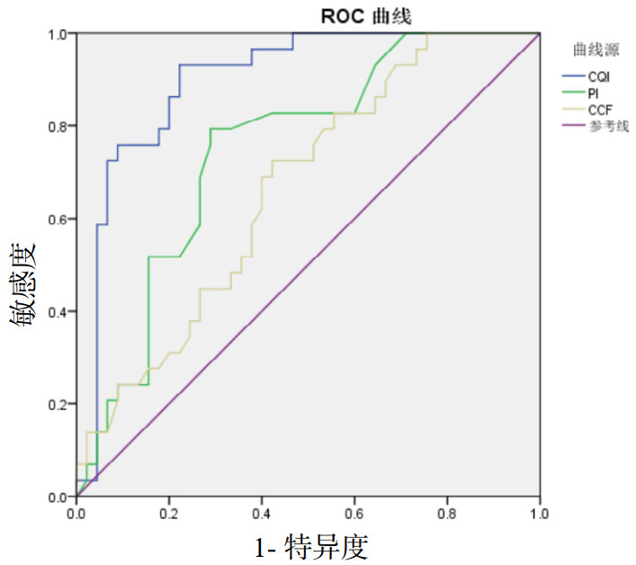 各参数ROC曲线间的差异检验结果见表 3,CQI与PI、CQI与CCF的AUC差异有统计学意义。