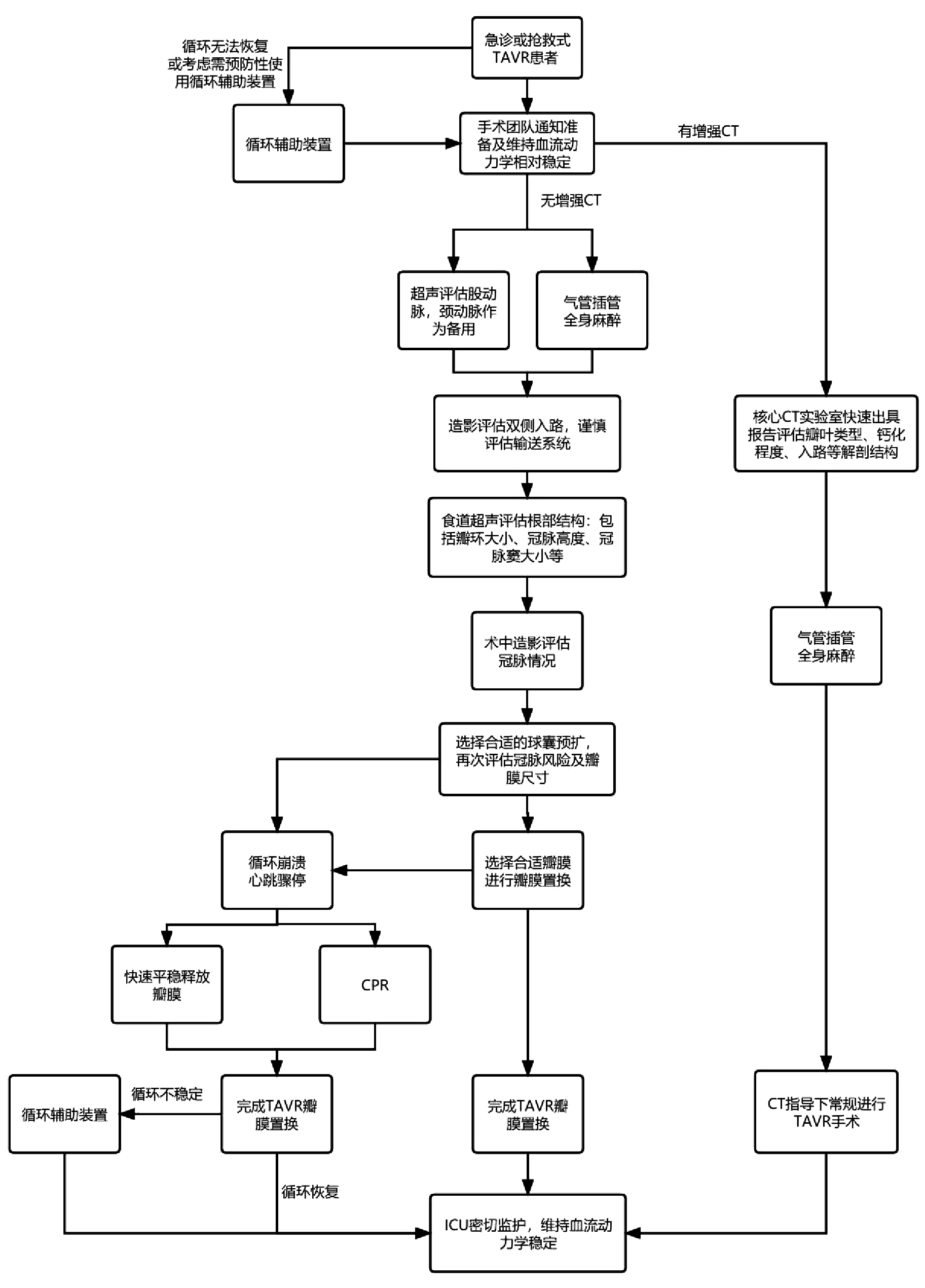 | CPR: Cardiopulmonary resuscitation, 心肺复苏术; ICU: Intensive care unit, 重症监护室 图 1 急诊TAVR主要流程图 Fig 1 Workflow of emergent TAVR |