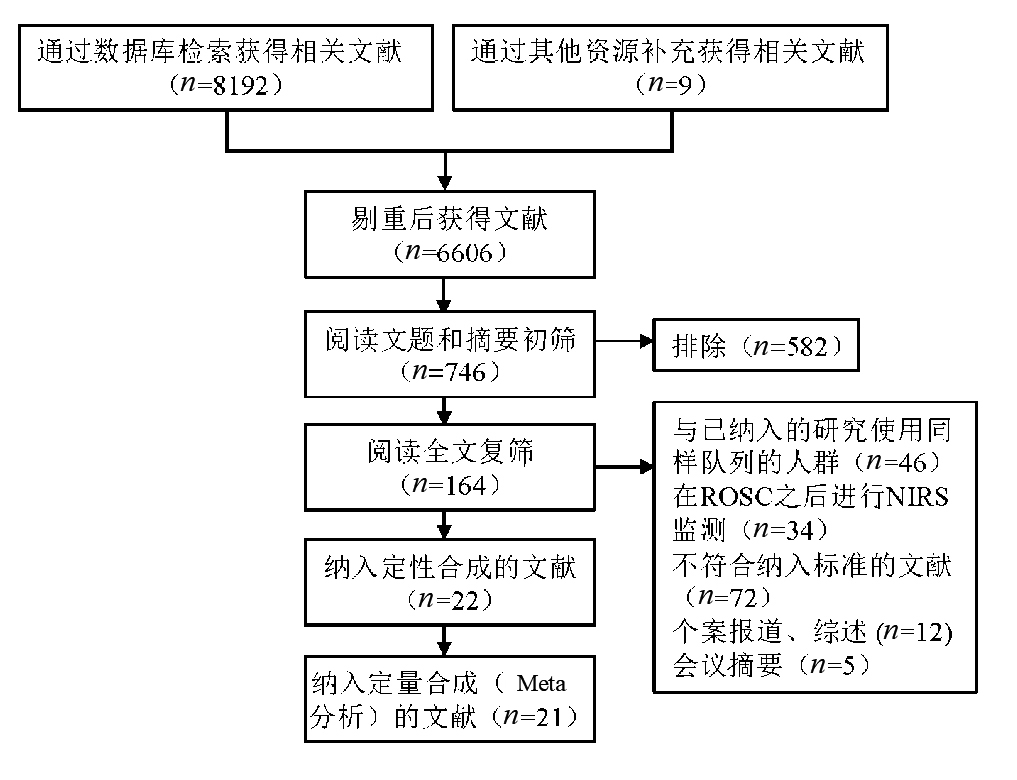 检索策略由两名作者制定,共检索PubMed、EMBASE、Cochrane Library、Web of Science、Clinical gov、万方、维普和中国知网8个数据库。该检索最初于2021年12月11日进行,并于2021年12月21日重复进行。中文主题词包括:心脏停搏、心搏骤停、呼吸心跳骤停、猝死、心肺复苏、心跳骤停、心搏停止、胸外按压、近红外光、近红外光谱;英文主题词包括:spectroscopy、near-infrared、NIRS、rSO2、resuscitation、cardiopulmonary resuscitation、heart massage、heart arrest。检索已发表和未发表的研究,并对所有确定的文章和主要评论文章的参考文献列表进行回顾,无语言或时间限制。