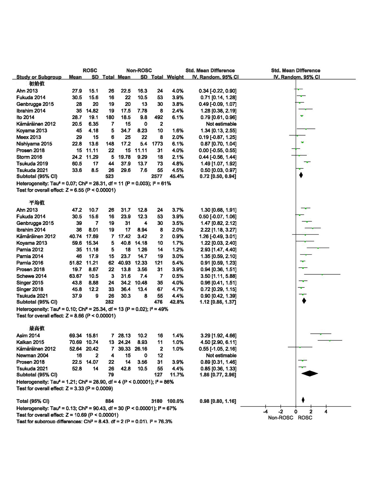 本研究收集纳入研究的作者、研究年份、国家、样本量、年龄均数、男性比例、用于测量脑血氧饱和度的NIRS仪器及所有脑血氧饱和度测量值。患者到达急诊科时、救援人员到达现场时或在复苏开始后尽快进行的NIRS rSO2测量值为初始rSO2。在CPR期间,并在ROSC之前获得的最高NIRS rSO2测量值为最高rSO2。在整个CPR期间获得的所有NIRS rSO2的平均值(不包括ROSC之后的测量值)为平均rSO2