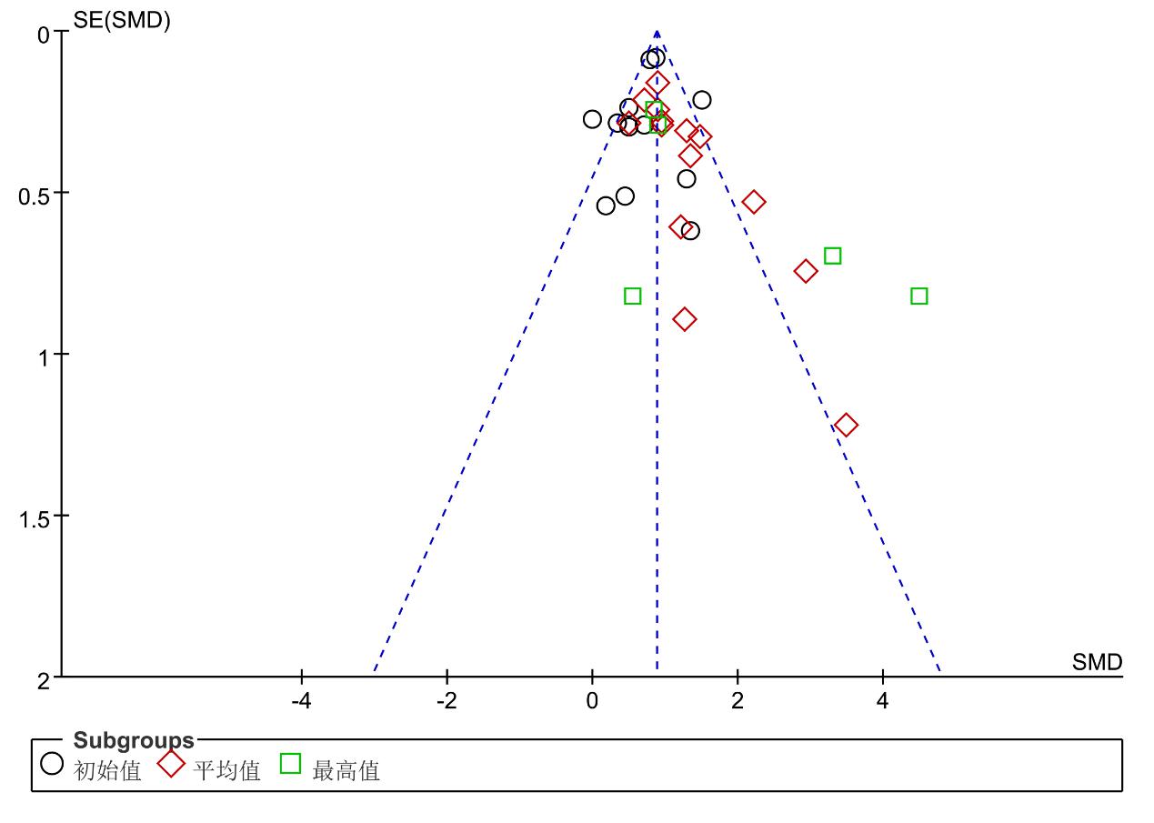 在纳入本研究的患者中,818名患者(20.6%)达到ROSC,根据收集的所有可用的测量值在同一分析中分为三种独立类型的测量亚组,见图 2。总分析结果的异质性I2为76.3%,不同子集之间的异质性是由于采集数据的类型不同所导致的统计学差异(χ2=8.43,P=0.01,图 2)所致。三个亚组的结果均显示NIRS rSO2的测量值可预测ROSC。但最高值(SMD=1.86,95%CI: 0.77~2.96,P<0.001)的异质性极高(I2=86%),而其他3项研究显示差异较小。初始值和平均值的异质性相对较低(I2=49%,61%),平均值(SMD=1.12,95%CI: 0.86~1.37,P<0.001)对于ROSC的预测效应高于初始值(SMD=0.72,95%CI: 0.50~0.94,P<0.001)。21项针对ROSC结果的研究中不存在发表偏倚,见图 3