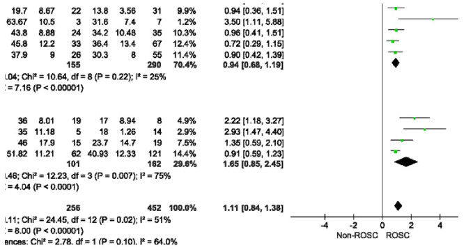 在评估院内和院外CA患者的13项研究中(其中1项研究因为包括了院内和院外的患者未纳入分析),共有708名患者纳入分析,有256名(36.2%)患者实现ROSC。不管是院内还是院外发生的CA,达到ROSC的患者比未达到ROSC的患者具有更高的平均NIRS rSO2值(SMD=1.11,95%CI: 0.84~1.38,P<0.001),NIRS rSO2平均值在预测院外CA亚组(SMD=0.94,95%CI: 0.68~1.19,P<0.001)与院内CA亚组(SMD=1.65,95%CI: 0.85~2.45,P<0.001)的预测能力差异无统计学意义(P=0.10)。见图 4
