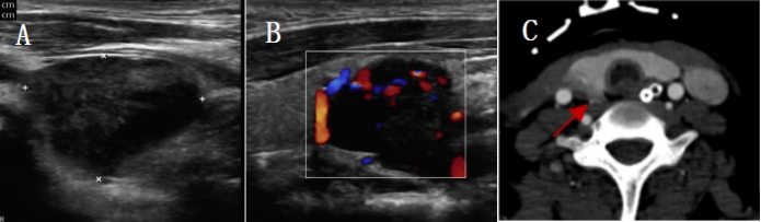 | A、B:多普勒超声示右侧甲状腺下极下方2.3 cm× 1.5 cm低回声;C:颈部CT示右侧甲状腺后方结节(箭头所指部分) 图 1 甲状旁腺术前影像学定位检查 |